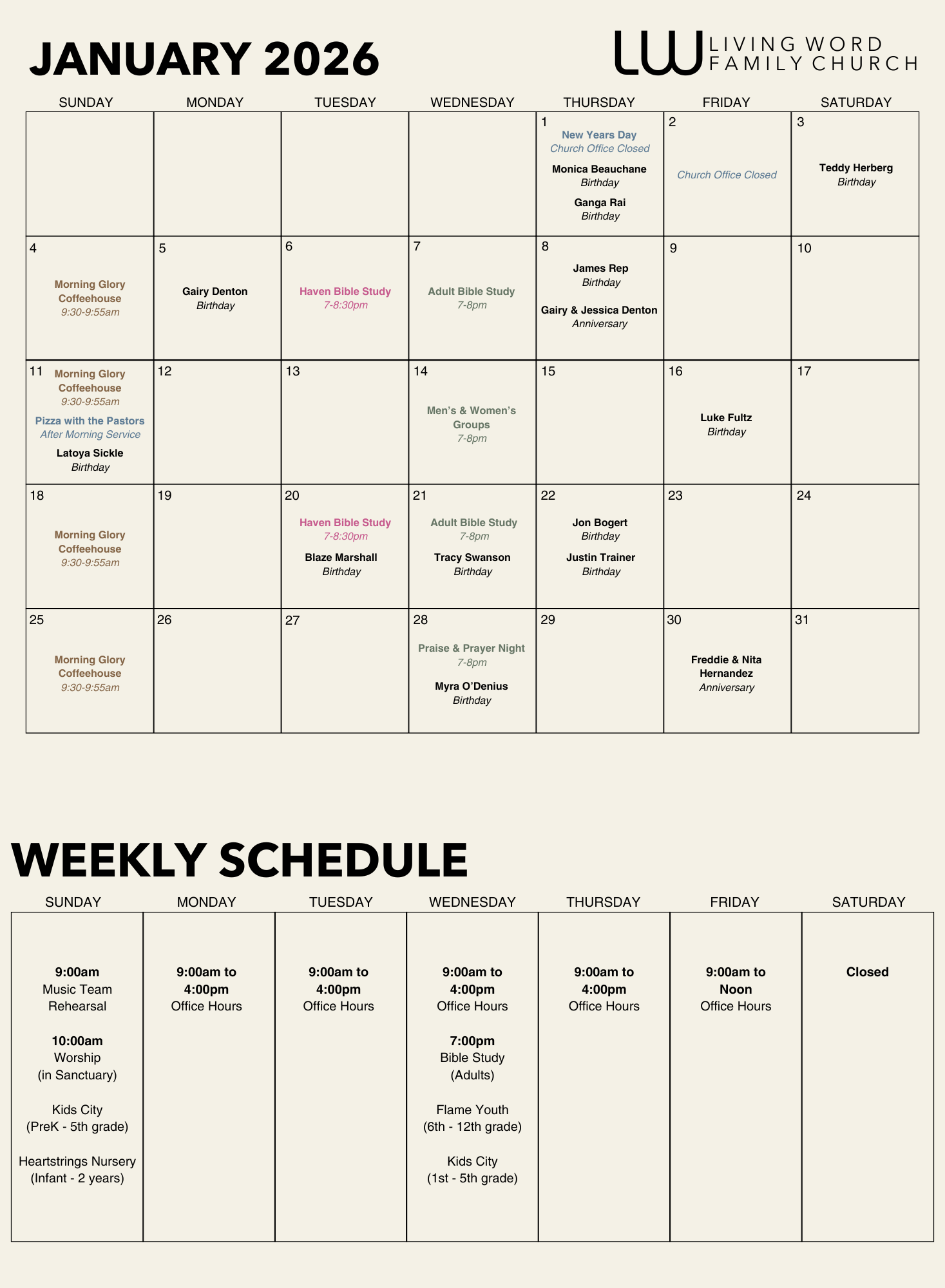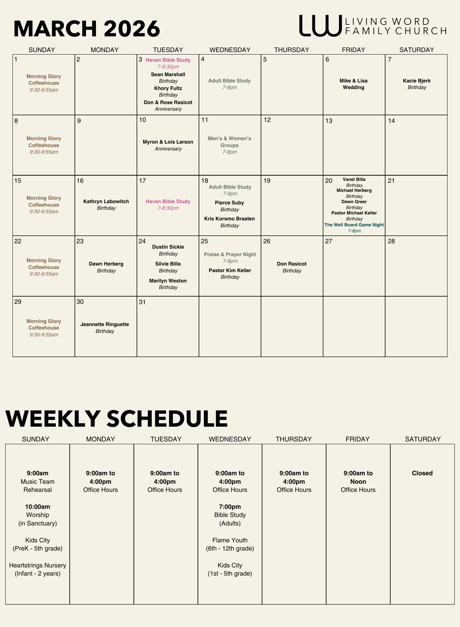 Living Word CalendarBelow is our monthly and weekly calendar so you can stay up to date with what’s going on at Living Word Family Church!